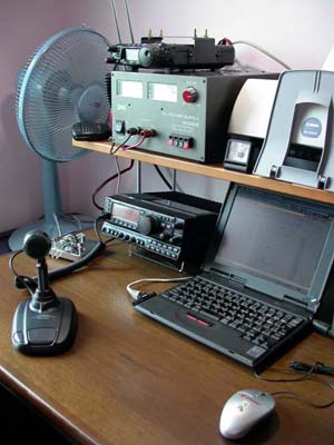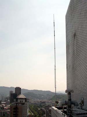 台湾在住の、JJ1TBB河崎さんから、ご自宅のシャックとアンテナの写真をいただきました。 現地のライセンスを得て、ますますご活躍の河崎さん。 ホットでタイムリーな写真を、ありがとうございました。 リグはHFがFT900。6m用にFT857です。いずれも100W。 アパートメントは22階建てです。屋上から5DFBで100m引いてます。 アンテナは、左方向が北です。南側に高さおよそ7mの機械室。 R6000は全長5・8mで、すっぽりかくれています。 | Back |