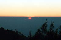 (ブロモ山(実はプナンジャカン山)山頂の日の出 てっきり黒い地平線の上に出てくるとばかり思っていたのですが、意外にもこの黒い地平線の途中?から出てきました)