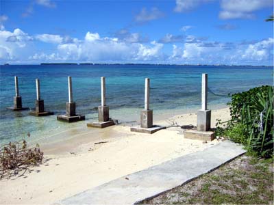 先端の杭まで手前のコンクリートの段差から18mある。間隔は3m弱、 高さ約2m、上部で約30cm角。