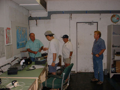 ミッドウェイに到着後、当時島のマネージャーであったNH6D Billからアンテナについて説明を受けているところ。 左から、NH6D Bill、W1VX(私)、N7AZS al(同じ予定で来島していたハム)、Mike Daak(島の通信責任者)