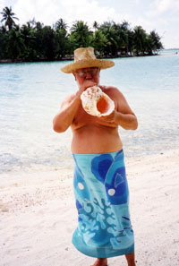 お別れの朝、スタン氏はホラ貝を吹いて見送ってくれました。