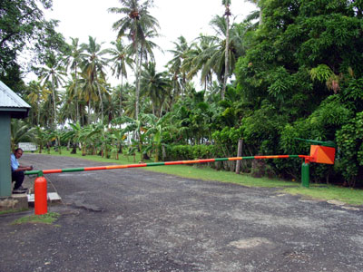 Blue Lagoon Resortの入口ゲート。機関銃が重り代わりに使用されている)