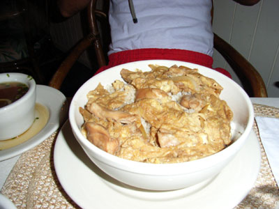 親子丼。本当にどんぶり飯、3人前位あり分け合って食べた。