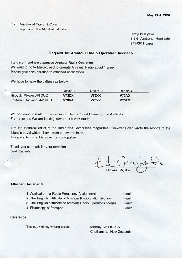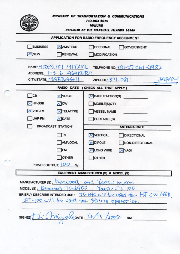 たまたま、その同じ時期に、私がいろいろ航空券を頼んだりしている旅行会社が「マーシャルに日本人がいて、無線の免許取得をお手伝いできます」と云って来たのが、すべての事の始まりなのです。