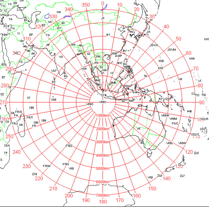 三宅さんから、今回のExp用にと送っていただいた資料の一つに、クリスマス島を中心にした大圏地図がありますが、これを見ると興味深いことに、日本もアフリカ東海岸も同じ距離なのです、数10Wでも良く聞こえる道理です。