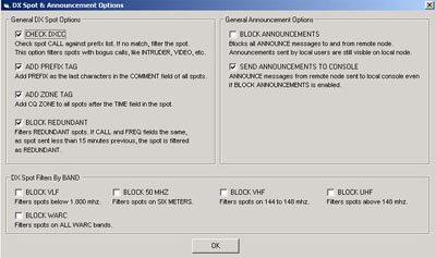 GENERAL FILTERでは、キーワードや、特定のノードからのスポット、或いはDXCC上の特定のエンティティ(例えば、JA、K、DL、Iなど)を配信しないように出来ます。